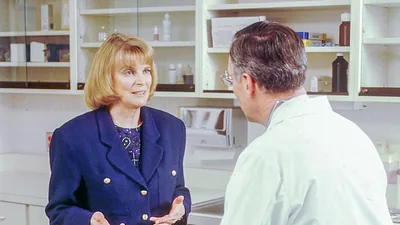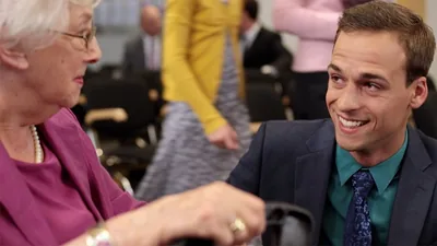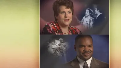 The woman preaching to an older woman. Her Bible teacher accompanies her in the ministry.