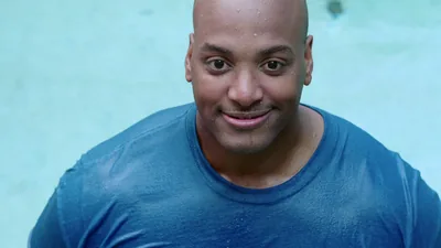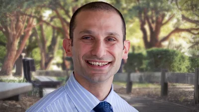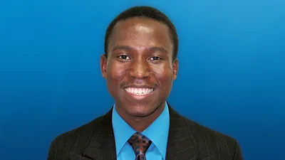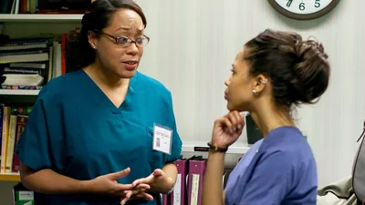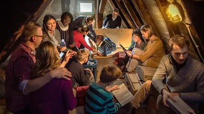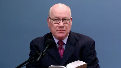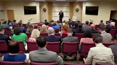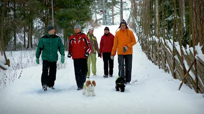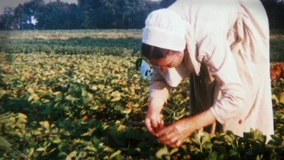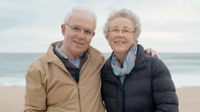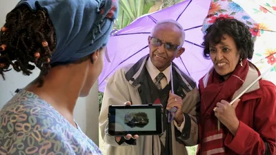 A young brother pushing the wheelchair of an elderly brother as they preach from house to house.