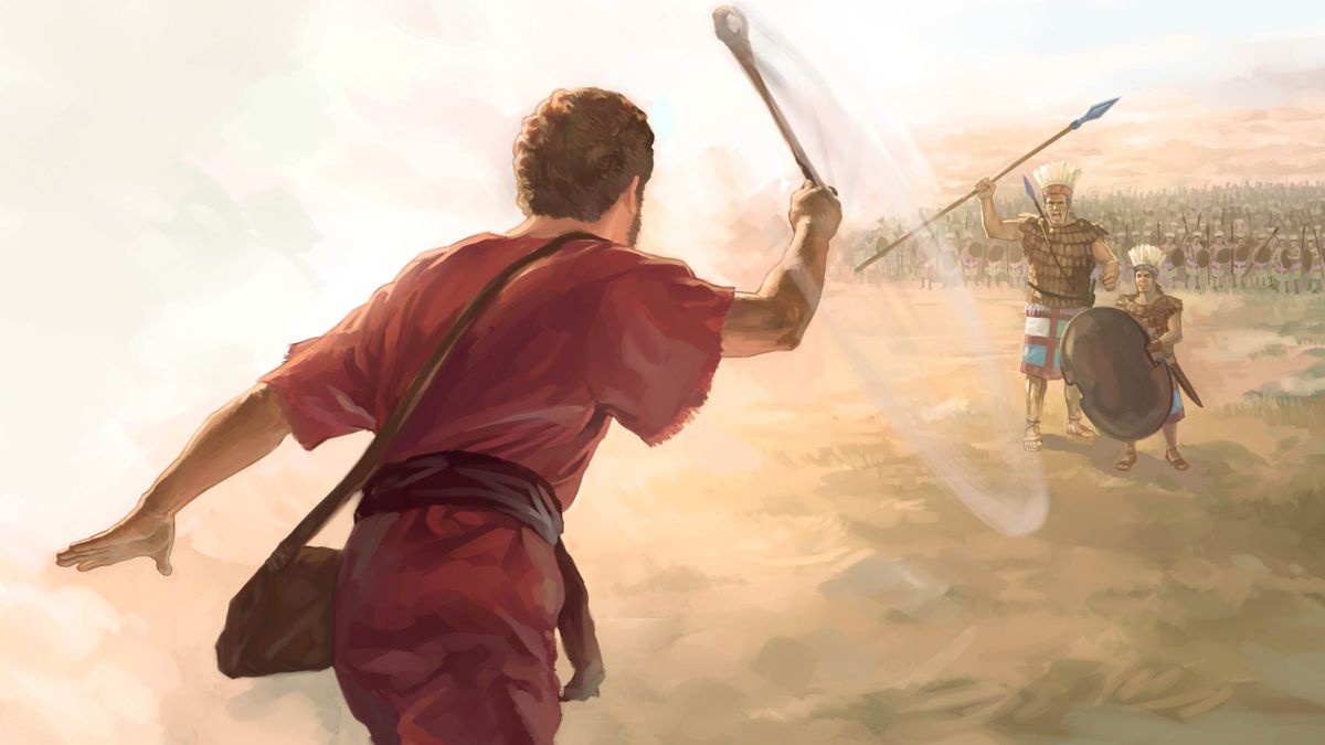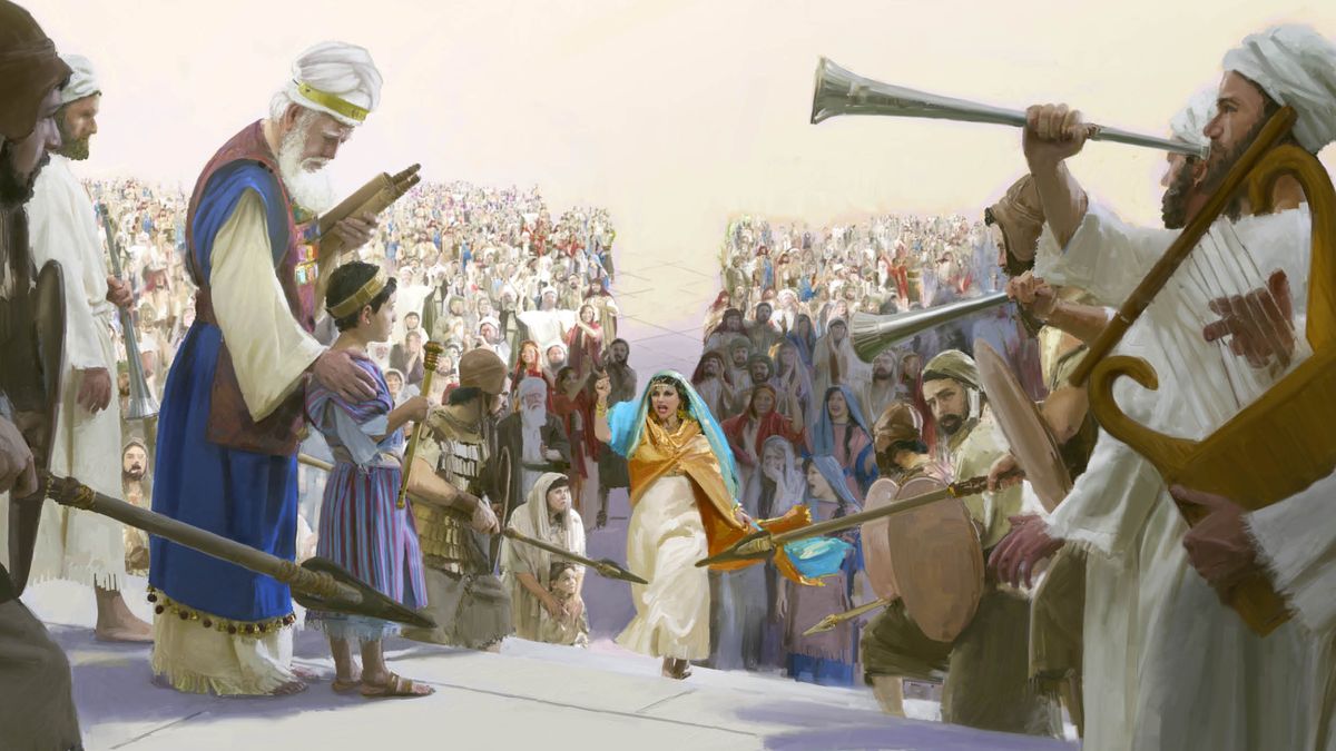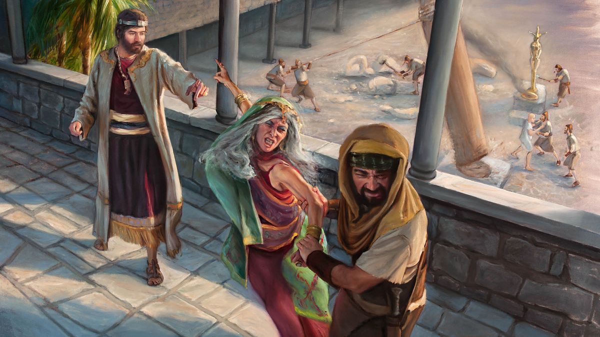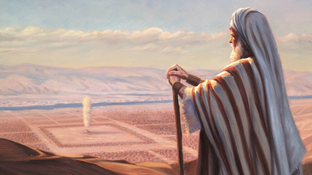 Moses lifting up his rod while Jehovah splits the Red Sea into two high walls of water.