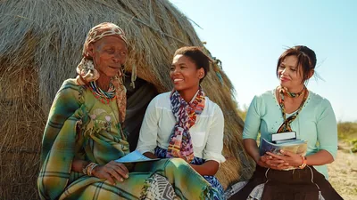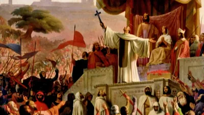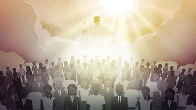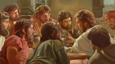 Jesus giving his Sermon on the Mount to a crowd of men, women, and children.