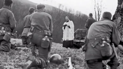 Collage: 1. Israelites worship a statue of a golden calf at the foot of Mount Sinai. 2. A man holding a rosary prays in front of a statue of the virgin Mary.